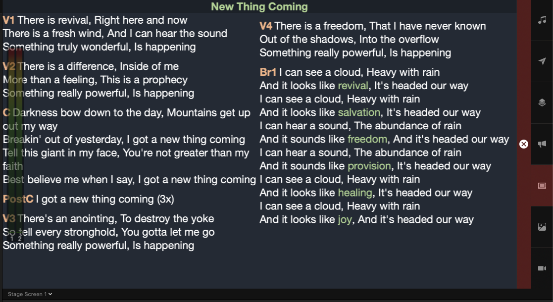 - Automatically generates full-page stage lyric displays using the ProPresenter API